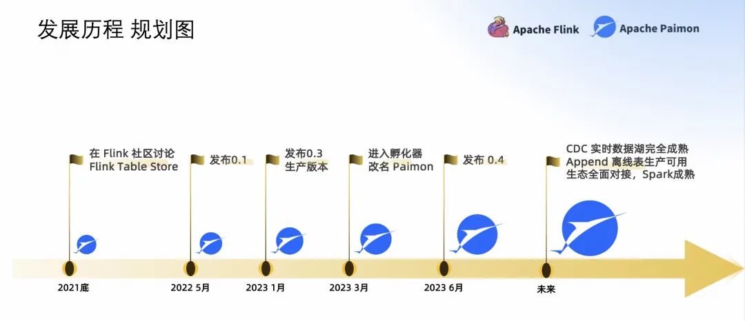 接下来回顾一下 Paimon 的发展历程。2021 年在 Flink 社区讨论;2022 年 5 月发布了 Flink Table Store 的第一个版本;2023 年 1 月发布了 0.3,它是 Paimon 的一个生产可用的版本;3 月进入了孵化器,改名 Apache Paimon。2023 年 6 月,发布了 Paimon 0.4。