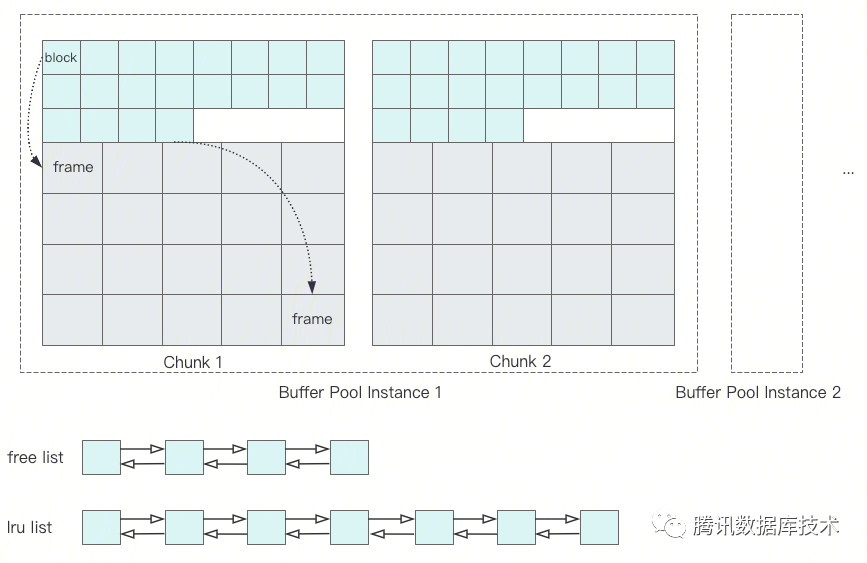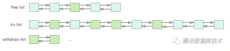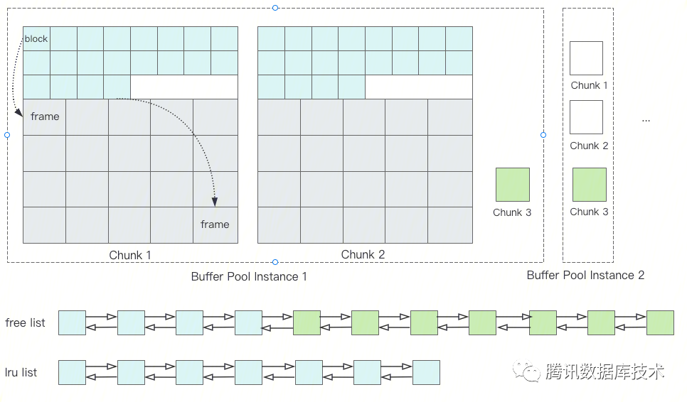 扩容逻辑相对简单,设置新的 Buffer Pool 大小后,会计算出需要增加的 chunk 数量,为新的 chunk 分配内存,初始化 block 和 frame,然后把 block 挂到 free list 上,后续使用仍然从 free list 上分配即可。图中绿色为新分配的 chunk 以及 chunk 上初始化的 block: