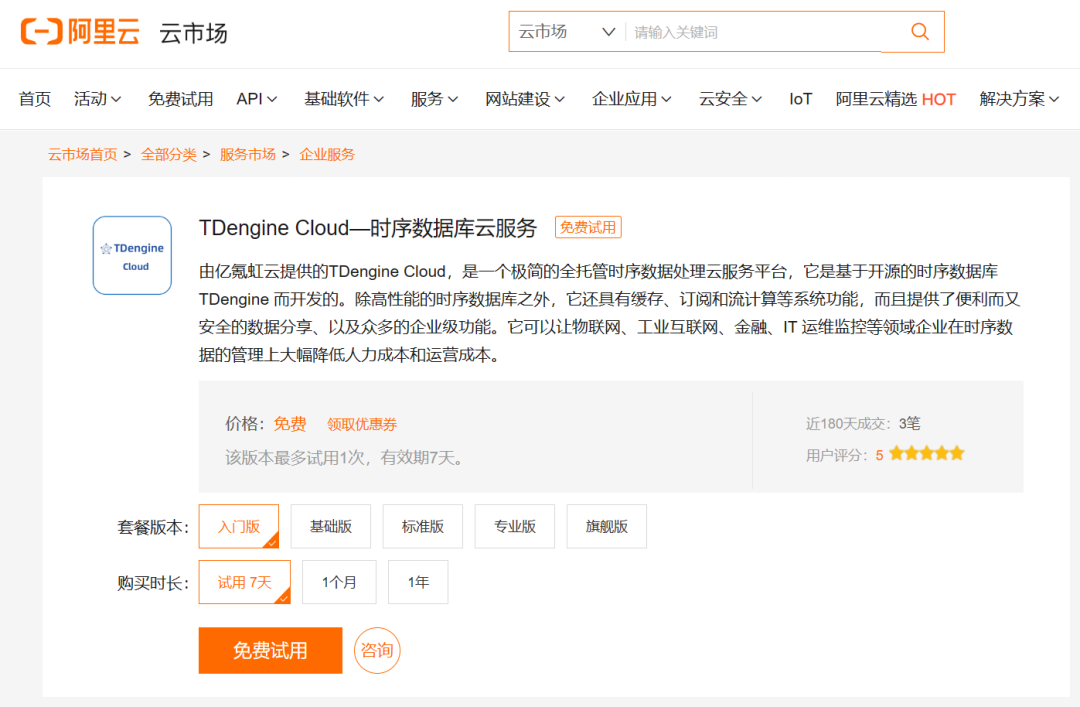 或打开阿里云官方网,点击搜索,输入关键词“TDengine”会出现商品卡片,点击即可进入商品详情页。如下: