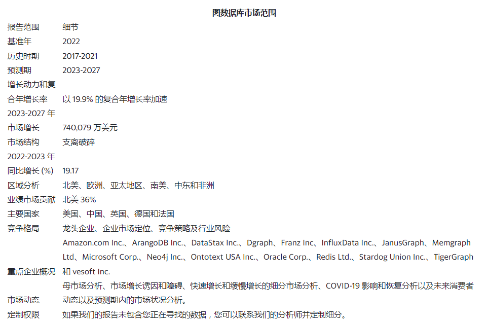图数据库市场报告包括有关领先公司的产品发布、可持续性和前景的信息,包括 Amazon.com Inc.、ArangoDB Inc.、DataStax Inc.、Dgraph、Franz Inc.、InfluxData Inc.、JanusGraph、Memgraph Ltd、Microsoft Corp.、Neo4j Inc.、Ontotext USA Inc.、Oracle Corp.、Redis Ltd.、Stardog Union Inc.、TigerGraph 和 vesoft inc.