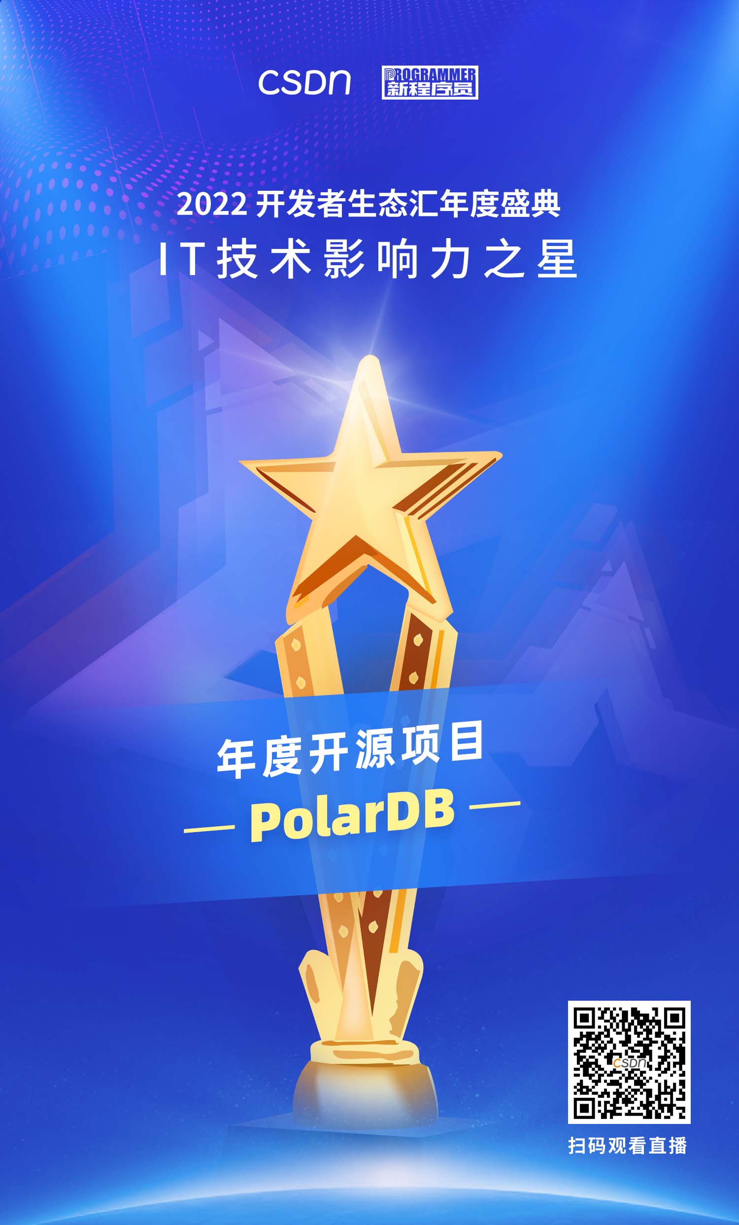 近日,CSDN联合《新程序员》举办的“开发者生态汇 —— 2022 IT 技术影响力之星”活动圆满落幕,阿里云自研云原生关系型数据库PolarDB获得“年度开源项目”荣誉。