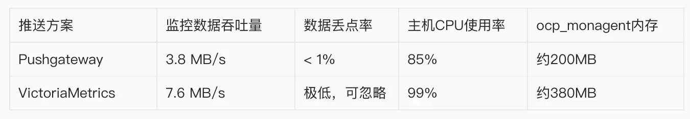 ocp_monagent限制了单核,最多占满1个核。OCP 3.3.0版本分别推送到Pushgateway和VictoriaMetrics(单机模式),在相同的压力情况下,压测结果如下(仅供参考):