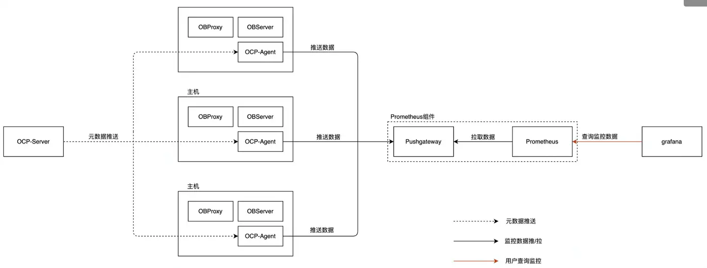 Pushgateway是Prometheus生态的一个组件,支持推送的模式。OCP-Agent将监控数据推送到Pushgateway,Prometheus再从Pushgateway拉取监控数据。