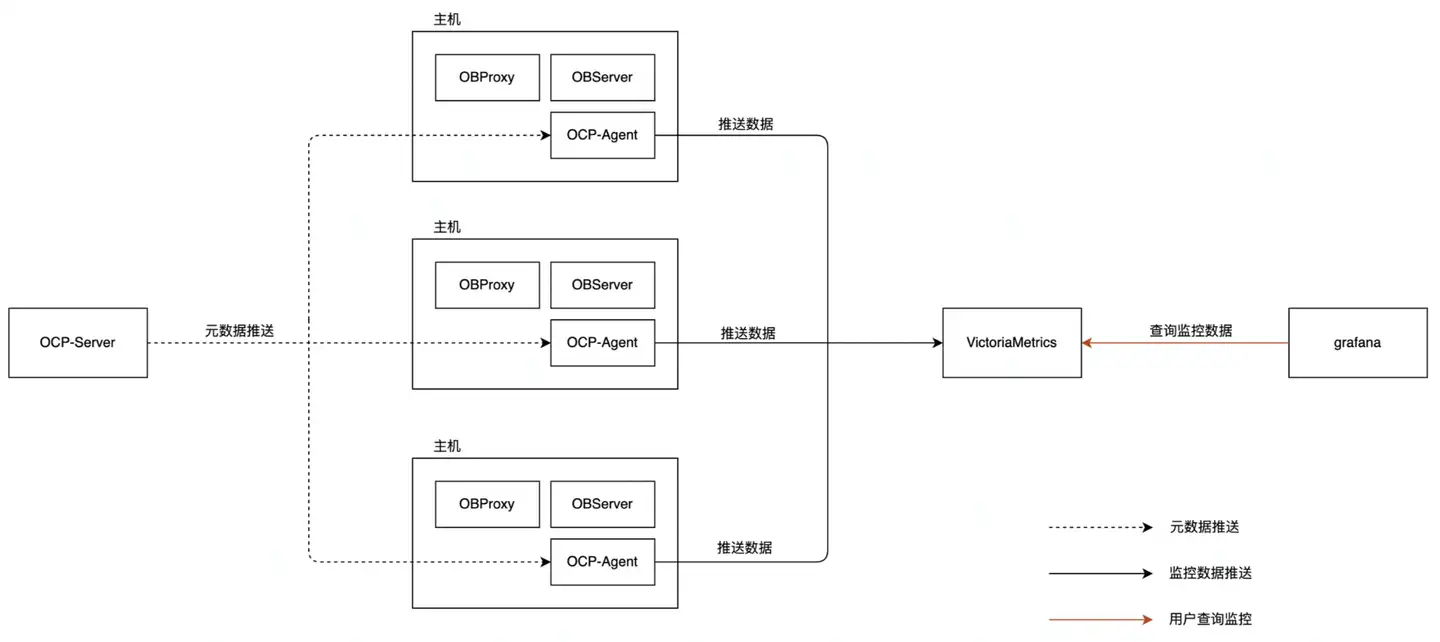 为了应对未来多样化的需求,OCP-Agent将推送地址做了扩展,可以推送到任意HTTP API。以推送到VictoriaMetrics为例,其部署架构如下所示: