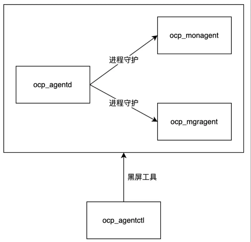 OCP-Agent是部署在主机上的管理、监控进程,其分为3个常驻进程和1个黑屏工具: