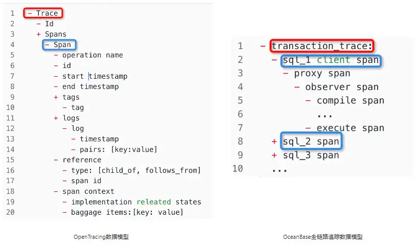 OceanBase 全链路追踪记录数据使用 OpenTracing 模型,该数据模型在分布式追踪系统中被大量使用,下图中左边是 OpenTracing 数据模型,右图是对应 OceanBase 全链路追踪的记录模型,一个 Trace 对应于一个数据库的事务,每个 Trace 会对应多个 Span,比如一个 SQL 请求是一个 Span,Span 中会记录某个过程执行相关信息,每个 Span 会记录一条日志持久化到 Trace 文件中。