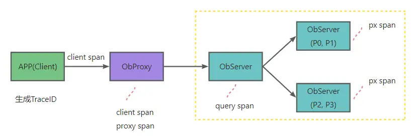 OceanBase 支持分布式环境下的全链路追踪能力。首先,OceanBase 作为一个分布式系统,当 OBProxy 接收到一个客户端请求后,有可能会将其路由到 OBServer 集群中任意一台 OBbServer 上。同时,该请求涉及到的数据可能分布在不同的 OBServer 中。具体到 SQL 执行阶段,执行引擎会向不同的 OBServer 发送执行子任务 task,当 OBServer 数量很多时,这些 SQL 请求和 Task 具体是在哪个 Server上执行?Server 内具体各模块执行的耗时情况是怎样的?都会困扰运维人员。