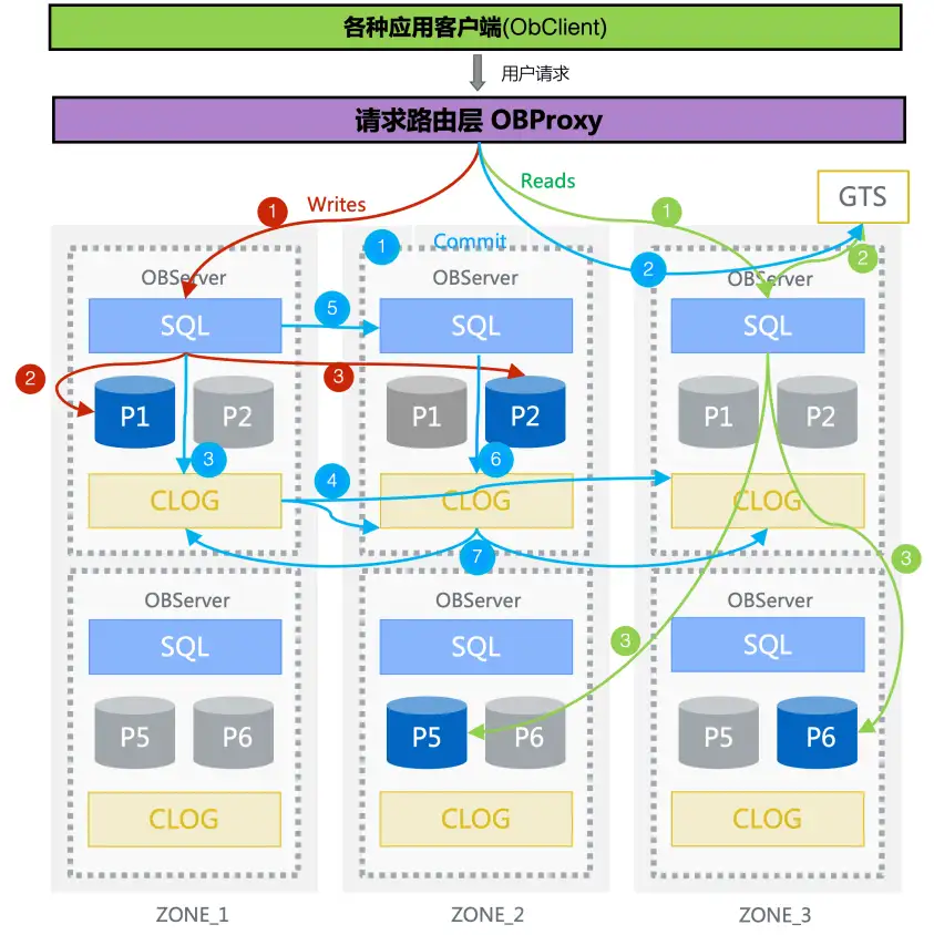 在 OceanBase 中,当用户发起一个请求后,首先会被发送给 OBProxy(SQL请求代理),由 OBProxy 路由转发到 OceanBase 集群,进入集群中的某一个 OBServer 节点,随后会经过 SQL 引擎、存储引擎、事务引擎等(不同的请求会涉及不同引擎中的诸多处理模块),该请求也有可能通过 rpc 任务访问多个 OBServer 节点的数据,最终将结果返回给客户端。