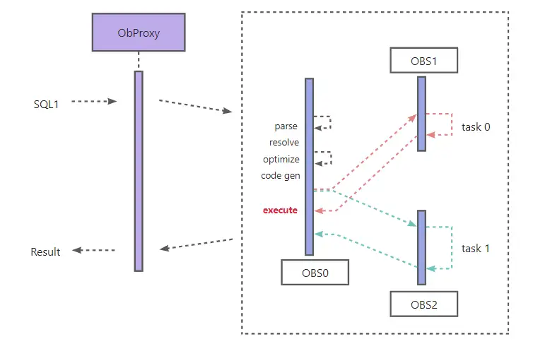 全链路追踪机制实现了 SQL 请求在分布式场景下,涉及多 Server 时完整执行链路的追踪。用户能够直观地看到是哪个 OBServer 上接收请求,哪个 OBServer 上执行远程 task,每个 task 的调度情况,以及执行耗时等信息。