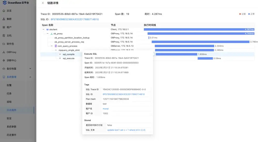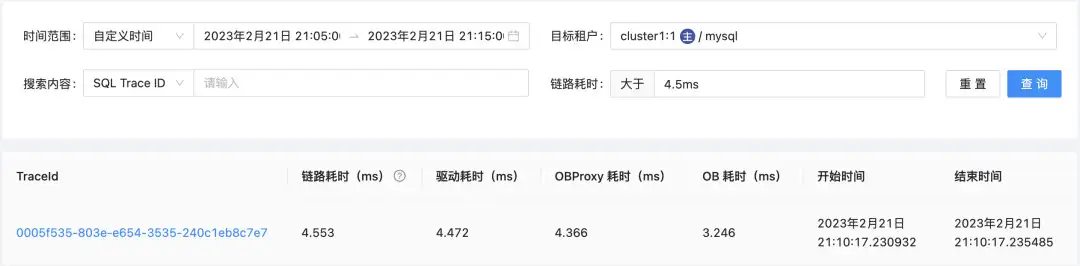 用户通过 OceanBase 运维平台(OCP),可以通过不同维度快速检索到有问题的请求,比如按耗时检索, 按指定 Trace id 或者 SQL ID 检索等,并且直观地看到请求从客户端到数据库内部全链路各组件的执行信息, 方便快速定位出问题的阶段。