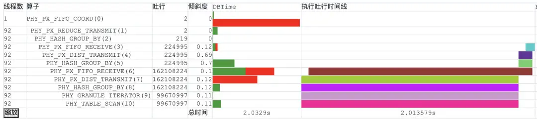 举例来说,我们通过全链路追踪定位到是 SQL 执行引擎慢,则可以通过 SQL 请求的 sql_trace_id 关联,自动跳转到 SQL Plan Monitor 诊断机制,查看执行计划各线程各算子执行情况。如图 5 所示,可以看到每个算子执行 CPU 时间(DBTime 绿色)、等待时间(DBTime 红色)、算子返回行数等信息。