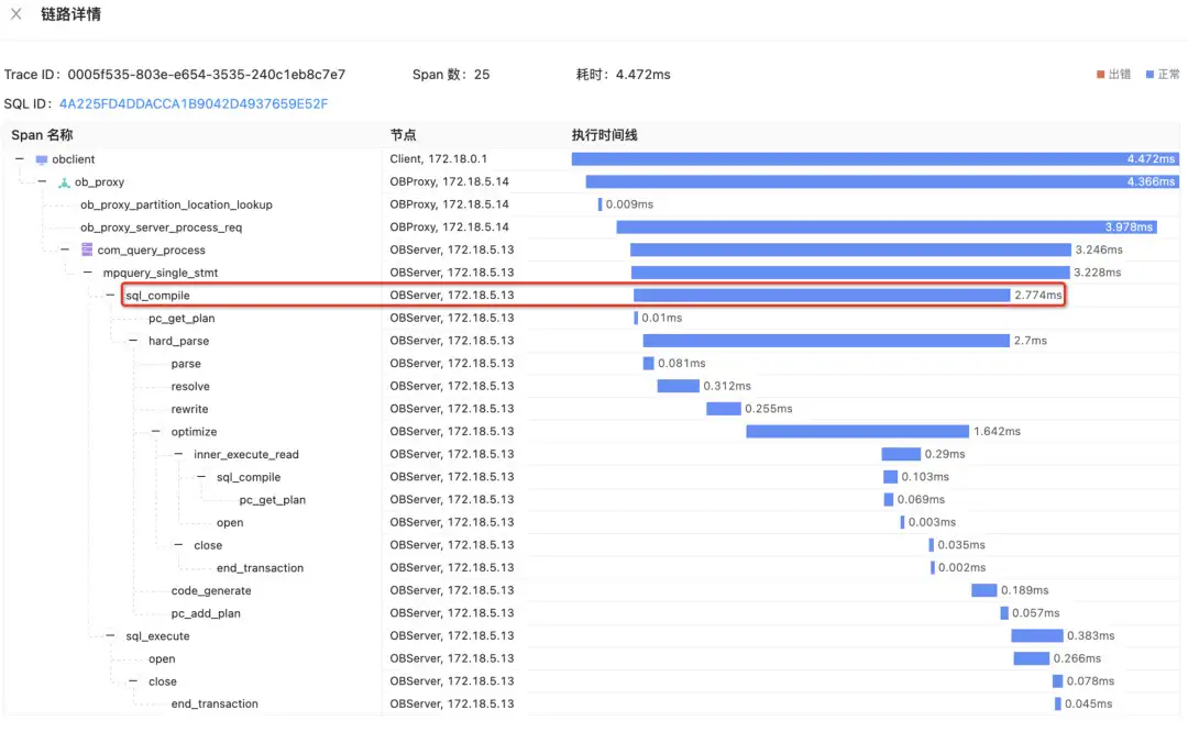 当确定耗时高的请求后,接下来我们需要诊断具体是哪里出了问题。此时,用户可以在 OCP 中直接点击有问题的 Trace id,展开请求的 Trace 信息(如图 10 所示)。可以看到,从客户端视角看,该请求总共耗时是 4.47ms,OBProxy 视角总耗时 4.366ms,OBServer 中耗时是 3.246ms,主要耗时在 OBServer 端,进一步看,可以看到主要耗时在 SQL compile 阶段, 也就是 SQL 生成执行计划阶段。此时,我们便可以得出初步结论:这条 SQL 执行慢耗时高,是它没有命中执行计划导致的。