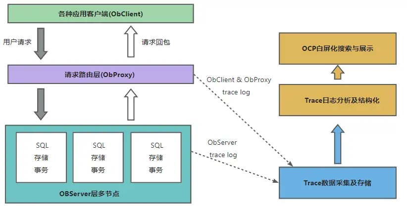 为进一步提高分布式场景下用户请求问题诊断效率, OceanBase 实现了全链路追踪机制, 能够追踪用户 SQL 请求在数据库全链路过程中,在不同阶段、不同组件执行的相关信息,并以可视化方式展现给用户,从而帮助用户快速定位问题所在位置。
