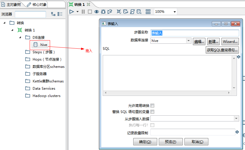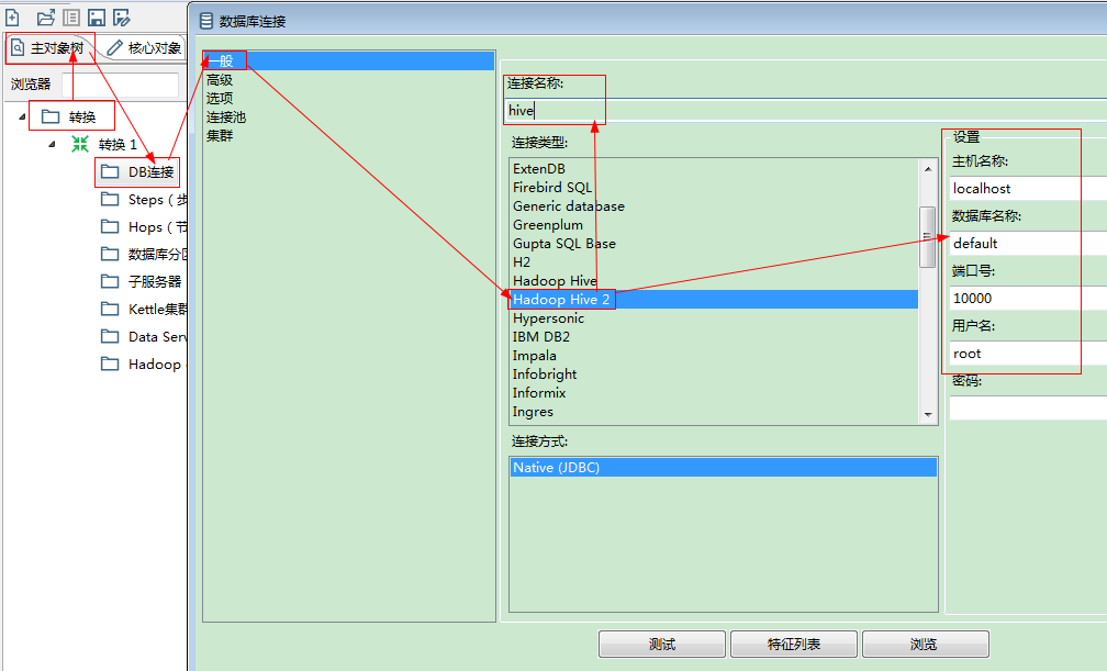 双击转换-》回到主对象树-》双击DB连接-》选择一般-》选择hadoop hive 2-》根据hive的实际情况填入连接信息,连接名称随便填: