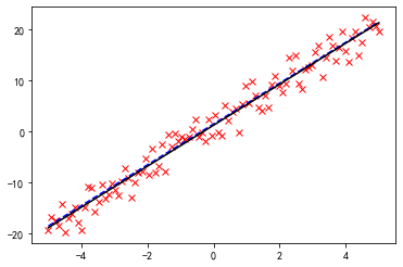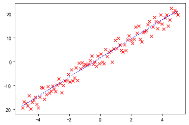 # 导入线多项式拟合工具:from numpy import polyfit, poly1d# 产生数据:x = np.linspace(-5, 5, 100)y = 4 * x + 1.5noise_y = y + np.random.randn(y.shape[-1]) * 2.5# 画出数据:%matplotlib inlinep = plt.plot(x, noise_y, 'rx')p = plt.plot(x, y, 'b:')