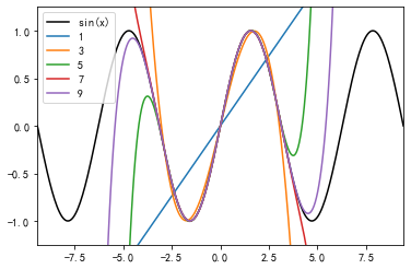 x = np.linspace(-3 * np.pi, 3 * np.pi, 300)p = plt.plot(x, np.sin(x), 'k', label="sin(x)")p = plt.plot(x, y1(x), label="1")p = plt.plot(x, y3(x), label="3")p = plt.plot(x, y5(x), label="5")p = plt.plot(x, y7(x), label="7")p = plt.plot(x, y9(x), label="9")a = plt.axis([-3 * np.pi, 3 * np.pi, -1.25, 1.25])plt.legend()plt.show()