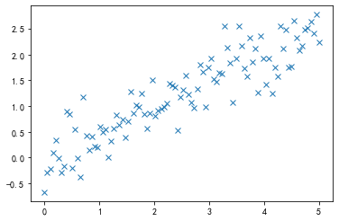x = np.linspace(0, 5, 100)y = 0.5 * x + np.random.randn(x.shape[-1]) * 0.35plt.plot(x, y, 'x')