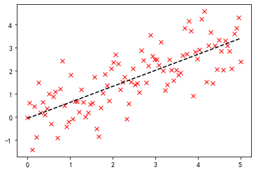 x = np.linspace(0, 5, 100)h = np.random.randn(x.shape[-1]) * 0.8y = 0.7 * x + hprint(f"原函数f(x)=0.7x+0.8*N(0,1)")X = np.hstack((x[:, np.newaxis], np.ones((x.shape[-1], 1))))# 求解:C, resid, rank, s = lstsq(X, y)print(f"拟合函数f(x)={C[0]}x+{C[1]}")print(f"残差平方和(sum squared residual) = {resid:.3f}")print(f"矩阵X的秩(rank of the X matrix) = {rank}")print(f"奇异值分解(singular values of X) = {s}")# 画图:p = plt.plot(x, y, 'rx')p = plt.plot(x, C[0] * x + C[1], 'k--')