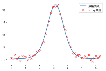 def function(x, a , b, f, phi):result = a * np.exp(-b * np.sin(f * x + phi))return resultIn [16]:from scipy.optimize import leastsqx = np.linspace(0, 2 * np.pi, 50)actual_parameters = [3, 2, 1.25, np.pi / 4]y = function(x, *actual_parameters)# 画出原始曲线:p = plt.plot(x, y, label="原始曲线")# 加入噪声:from scipy.stats import normy_noisy = y + 0.9 * norm.rvs(size=len(x))p = plt.plot(x, y_noisy, 'rx', label="noisy曲线")plt.legend()