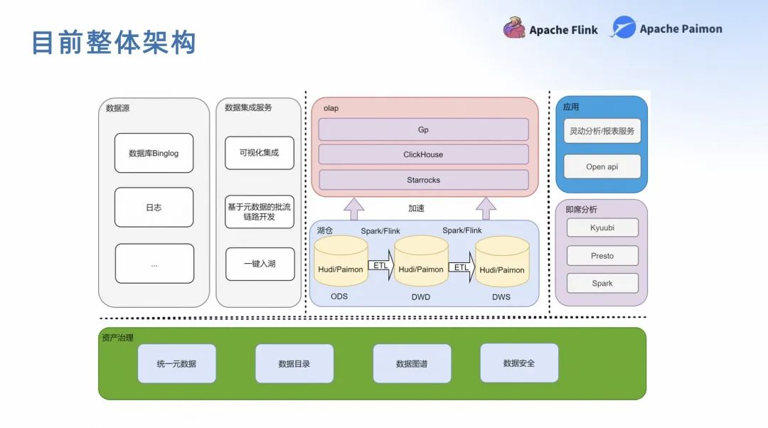 上图是目前的整体架构图。湖仓部分是 Hudi 和 Paimon 混用的阶段,加速层的 OLAP 主要使用 Starrocks。