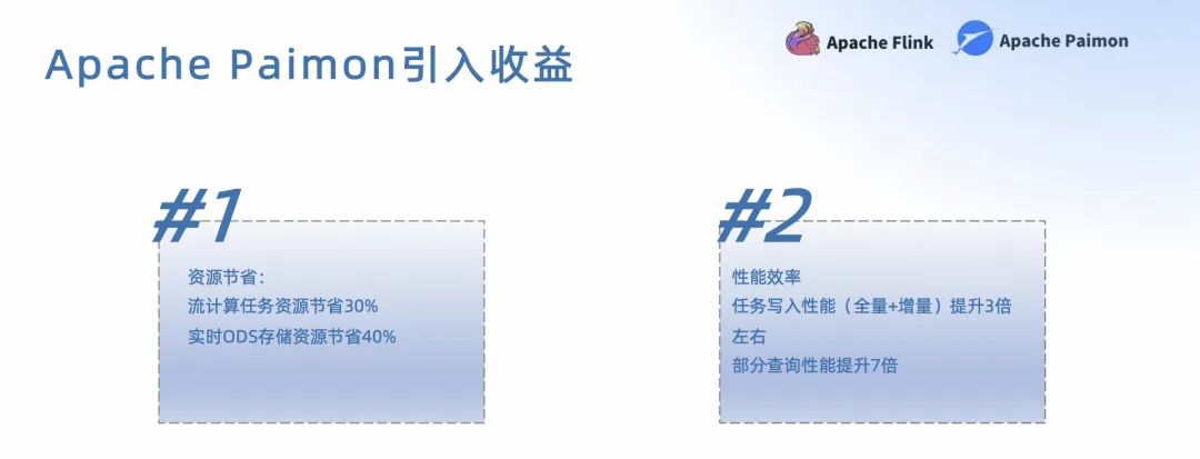 场景的应用是需要结合收益的,实践下来我们发现,Paimon 在摄入计算资源层面相对 Hudi 减少了 30%左右,实时 ODS 层的存储减少了 40%。其次在写入和查询性能上,全量和增量在相同内存配置的情况下,摄入的性能提升了 3 倍左右,查询的性能提升了 7 倍。在各大企业都在降本增效的背景下,这些收益对我们来说是非常可观的。