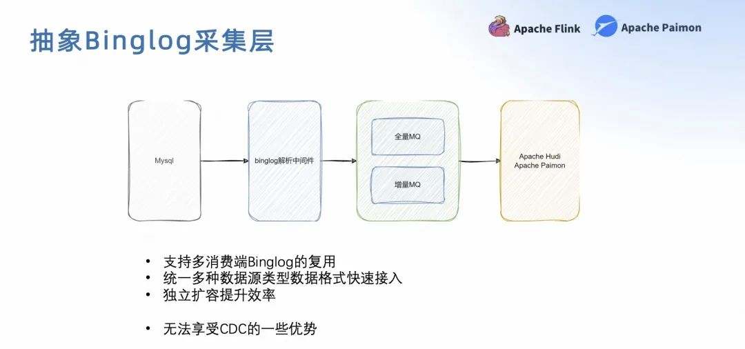 那么 Binlogo 解析中间键之后是消息队列。我们采用基于增量 MQ 的一个 Binlogo 的消息队列。这样做是为了减少 Binlogo 在应用过程中的重复生产,让同一个队列可以让多个消费者去使用。但这套框架的缺点也比较明显,就是无法像社区 CDC 那样进行完备的结构引进或者整库同步,未来我们也会去强化这一点。
