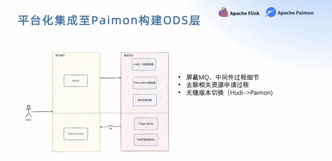 我们将集成进行了抽象,将集成分为两个层面。第一个是用户层,用户可以选择他们熟悉的业务数据。第二个是对接层,可以自动对接我们的数据库团队、中间件团队、消息队列团队。通过这样的抽象,在底层组件替换的时候就会非常方便。当时 Paimon 上线的时候大概只花了 1-2 天的时间进行对接。