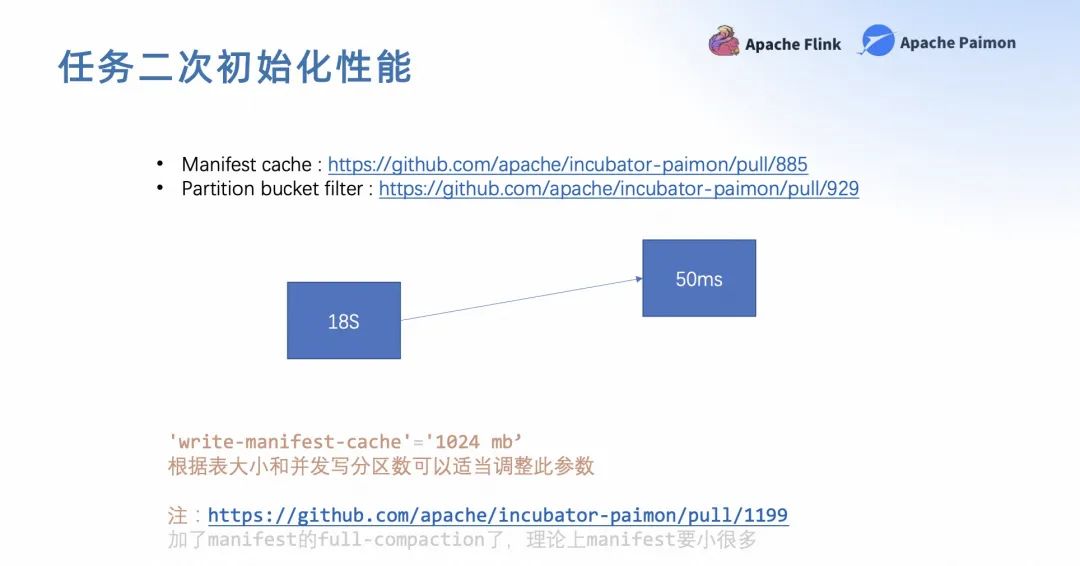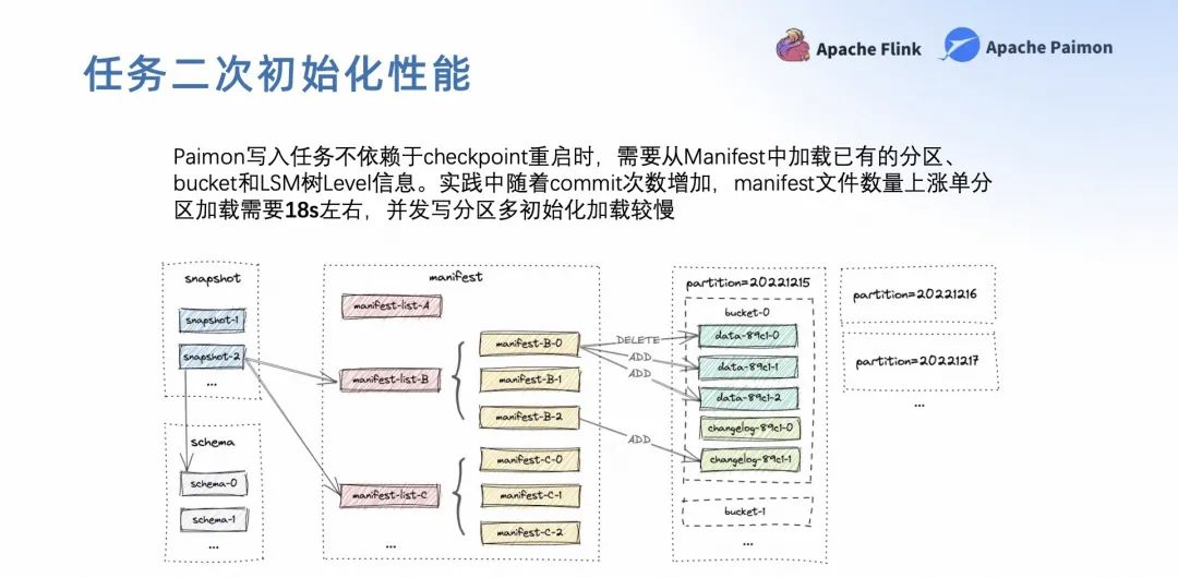 第一个问题,Paimon 在写入任务的二次初始化慢。Paimon 在写入任务不依赖于 checkpoint 重启的时候,它需要从 Manifest 里面加载已有的分区、bucket 和 LSM 树 Level 信息,用于后面的续写。在实践过程中,随着 commit 数量的增加,Manifest 数量的上涨也非常明显。我们实践下来单分区加载最大要花费 18 秒左右。并发写分区越多的情况下,初始化加载比较慢的情况就会比较严重。