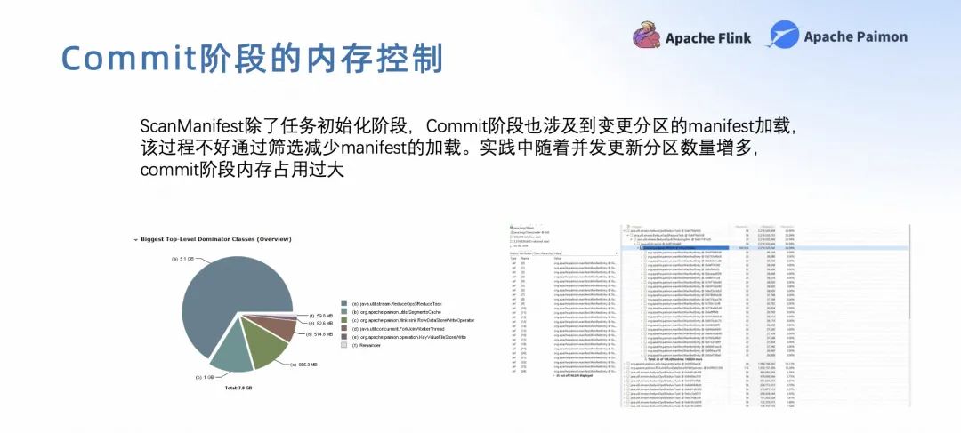 第二个问题,commit 阶段的内存控制。这个和 Manifest 的加载也有一定的关系,因为单次 commit 的变更分区和桶数是不固定的,commit 阶段可能会加载非常多的 Manifest,就会导致内存的占用过高,甚至出现 OOM 的情况。