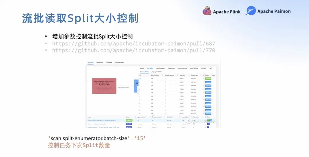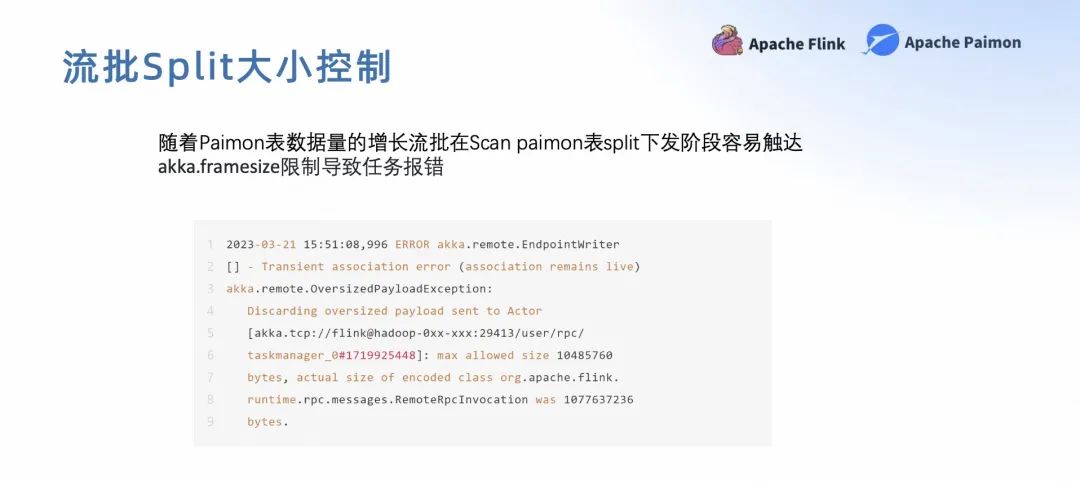 第三个问题,流批 Split 大小控制。随着 Paimon 表数据量不断的增长,流批读 Paimon 的时候,他的 Split 下发阶段可能会触发 akka.framesize 的限制,导致任务报错。从上图可以看到,这个报错不是很明显,所以不能很快的去定位到它的根因。