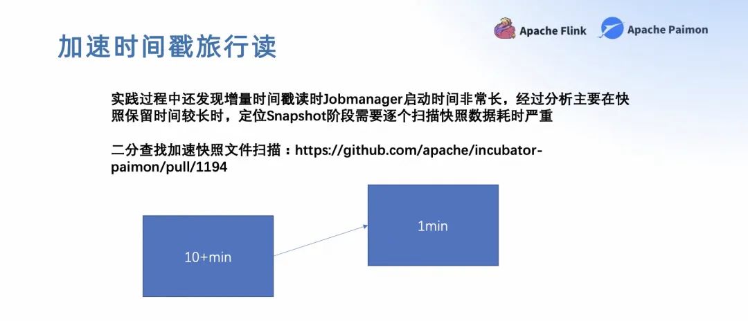 第四个问题,加速时间戳旅行读。在时间旅行过程中,比如我们读取某一个时间戳的数据量的时候会发现,初始化 Jobmanager 耗时非常久。经过分析主要是在根据时间戳定位 Snapshot 这个阶段,原来用的是遍历的模式,耗时基本上会在 10 分钟左右。后来我们改成了二分的模式,耗时从原来 10 分钟缩短到了 1 分钟不到,就能根据具体的时间戳定位到某一个快照信息,快速的将整个数据读取出来。
