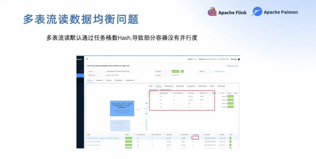 第五个问题,多表流读数据均衡问题。在多流读的时候,我们发现有一些 task 和 slot 没有被分配任务,也就是说它处于一个空闲的状态。内部我们增加了表名和分区的 Hash 条件,如上图。