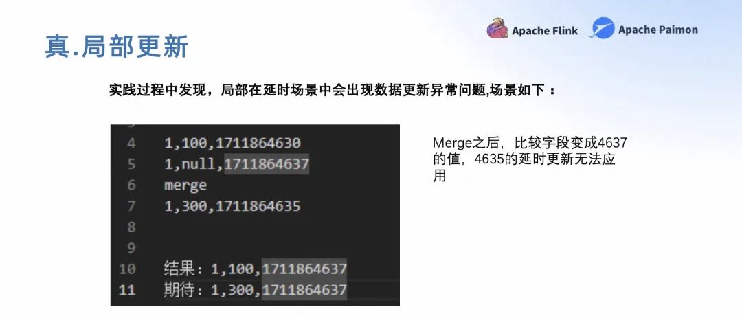 第六个问题,局部更新。在实践过程中我们发现,局部更新在延时场景中可能会出现数据更新异常的情况。如上图所示,两条数据在经过 Merge 之后,比较字段变成了 4637 的值,但 4635 的延时更新就无法应用了。因为 4635 比 4637 要小,最终导致数据不一致。