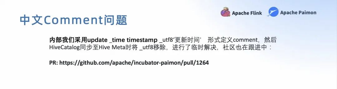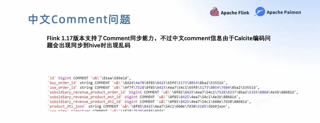 第七个问题,中文 Comment 乱码的问题。目前在 Flink 1.17.2 上已经有 Flink 的 pr 进行修复了,大家可以升级到 1.17.2 上去解决。