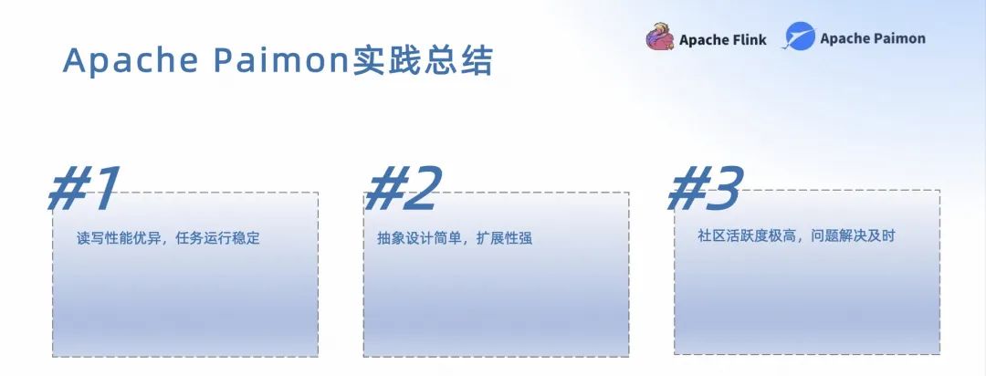 最后总结一下整个实践过程,首先,Paimon 的读写性能是令人印象非常深刻的;其次,其非常简单的抽象设计,带来非常强的扩展性;最后也是最重要的一点,有一帮非常活跃的人,基本上有什么问题都能非常迅速的得到解决。