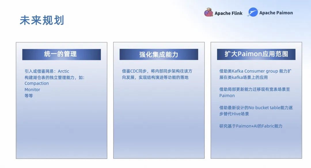 扩大 Paimon 的应用范围。比如 Paimon 里类似于 Kafka Consumer group 的能力,取代有部分需要保留时间更长的 kafka 的场景。同时也会扩大局部更新的应用范围,以及正在设计中的 No bucket table 的能力,能够很好的去替代 Hive 场景。此外,还会跟进 AIGC 的能力,加上 Paimon 构建 Fabric 的能力,未来会有更多的应用场景。