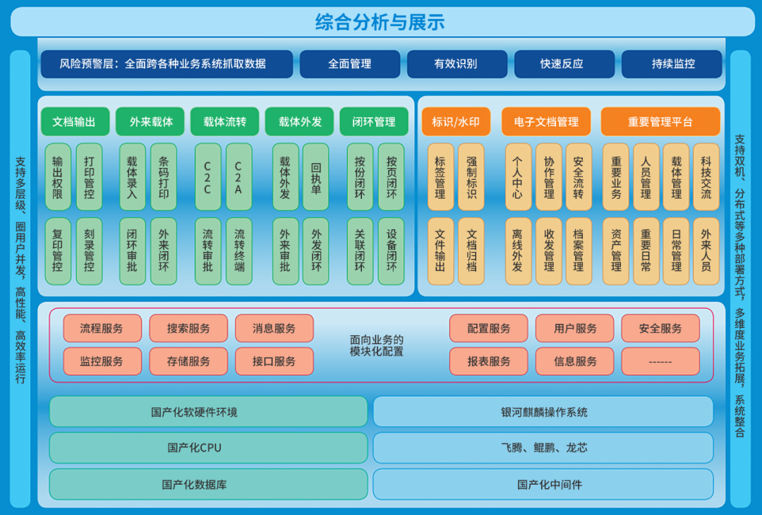 在某市中级人民法院智慧文印办公建设中,采用本方案实现服务器及客户端全面国产化创新,在银河麒麟桌面操作系统及高级服务器操作系统上,对用户单位的自有载体、外来载体、载体流转、载体外发、载体闭环进行全生命周期管理,提升了重要的纸张及光盘的载体安全管理水平。