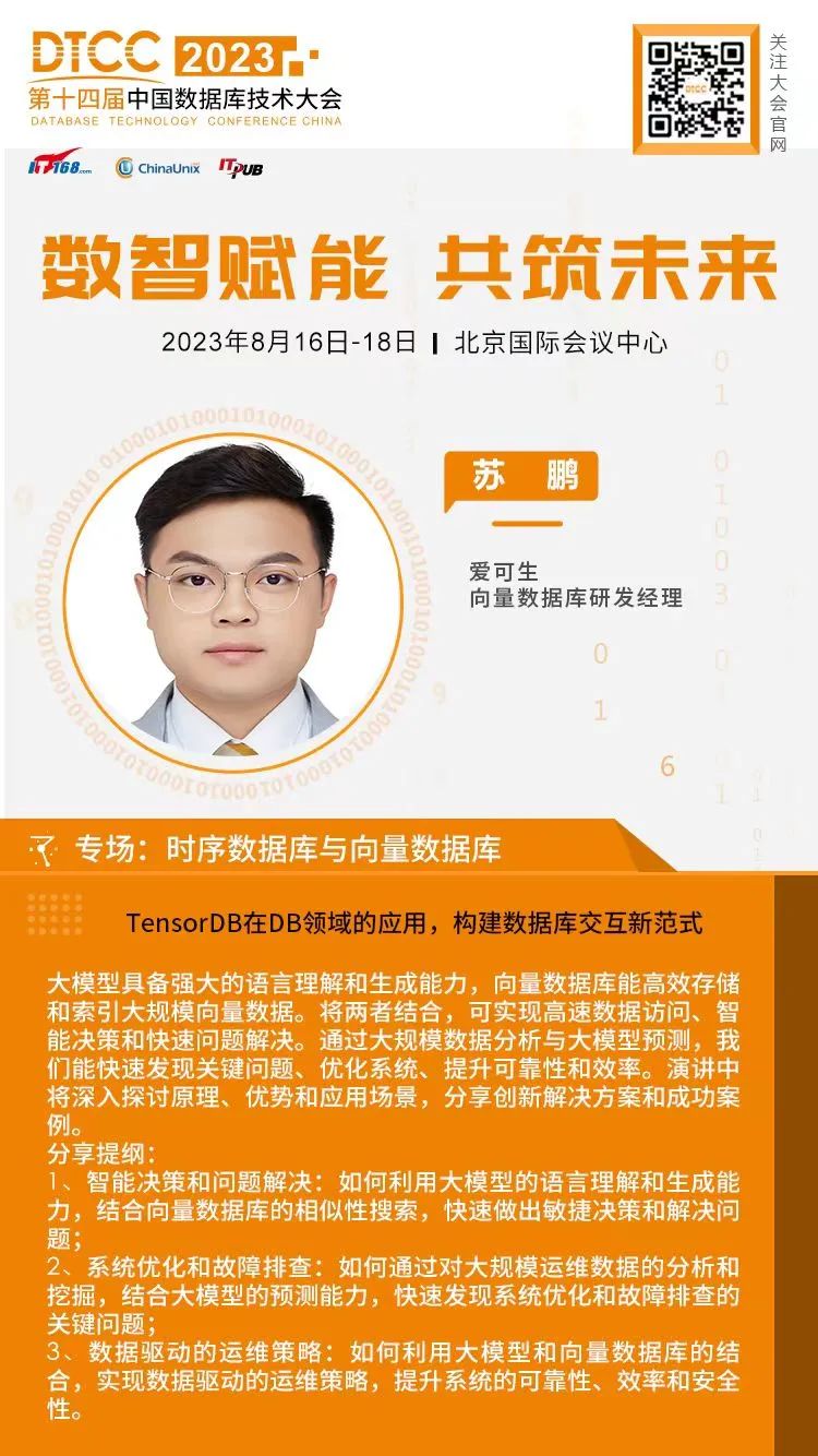 来自爱可生的向量数据库研发经理-苏鹏,将在 时序数据库与向量数据库 专场带来题为《TensorDB 在 DB 领域的应用,构建数据库交互新范式》的演讲。