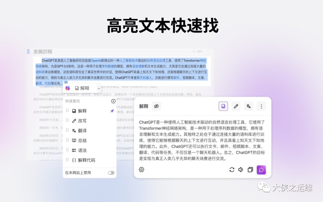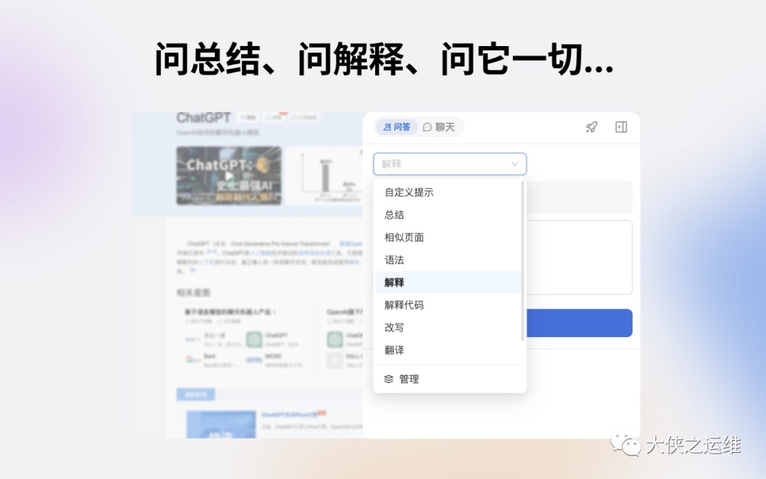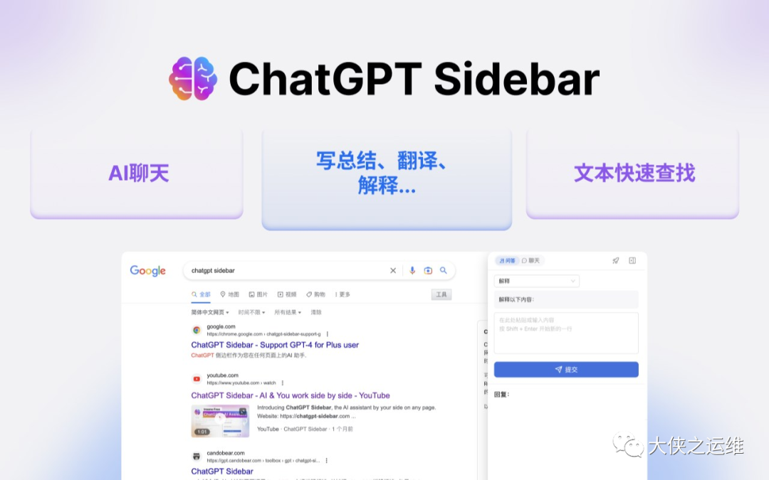 你可以用它来 📰 👀摘要一篇文章 🔍 查找相似的页面 🤔 解释任何概念 👨💻 为程序员解释代码 🌍 🔤 翻译到任何语言