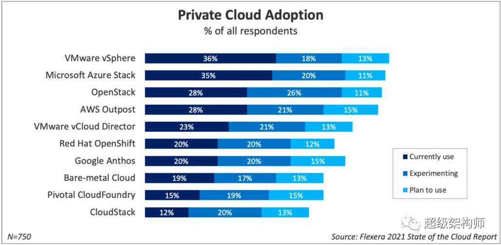 在 Flexera 的 2021 年云状况报告中,750 名全球云决策者被问及有关其技术采用的各种问题。结果表明,CloudStack 和 OpenStack 都很受欢迎,OpenStack 仍然是市场领导者。