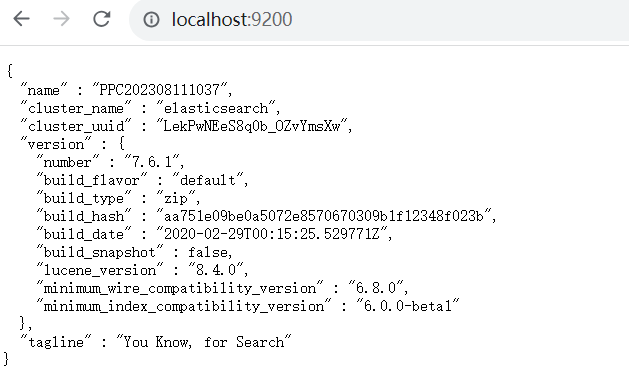 执行localhost:9200看到当前页面代表运行成功。