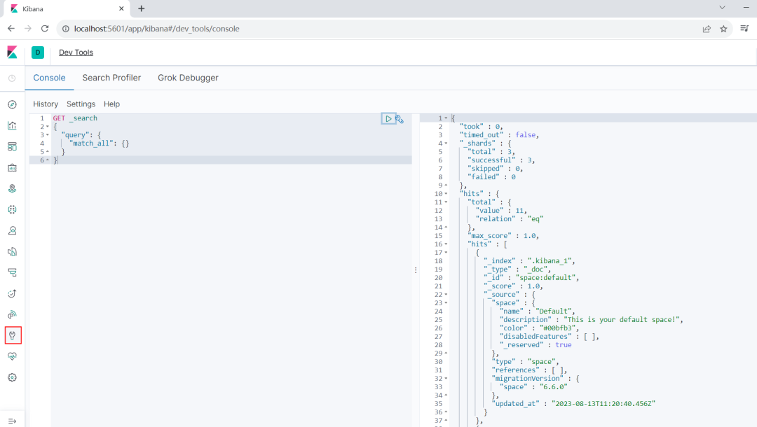 4、点左边图标dev Tools,可以看到我们的DSL语句。这个语句的含义是查询query,match_all所有的数据。
