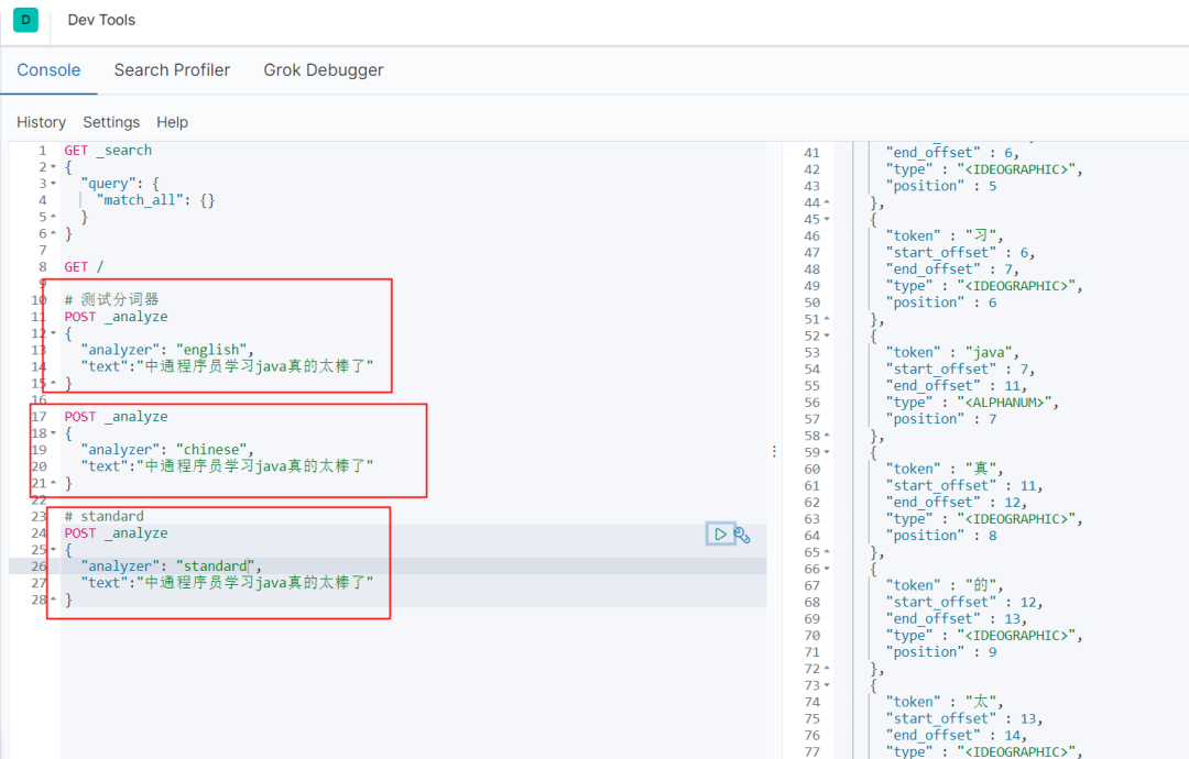 Dsl语句有两个字段,analyzer表示分词器,standard是默认分词器,text则是需要分词的文本。