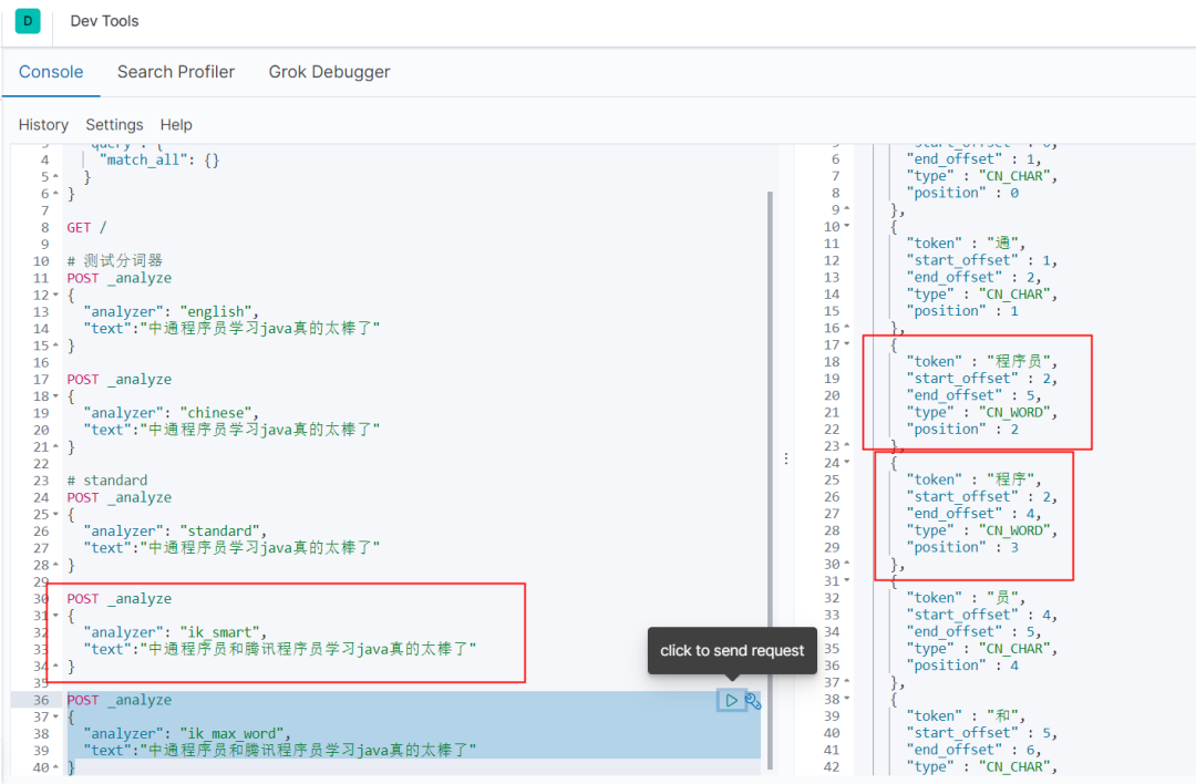 Es默认的分词器对中文处理并不友好,我们发送一个post请求,analyze表示分析。