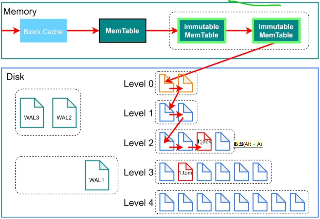 PS:level 0是原文件,默认当原文件有4个时会进行compaction。对SST进行查找会使用二分查找(因为SST是排好序的)