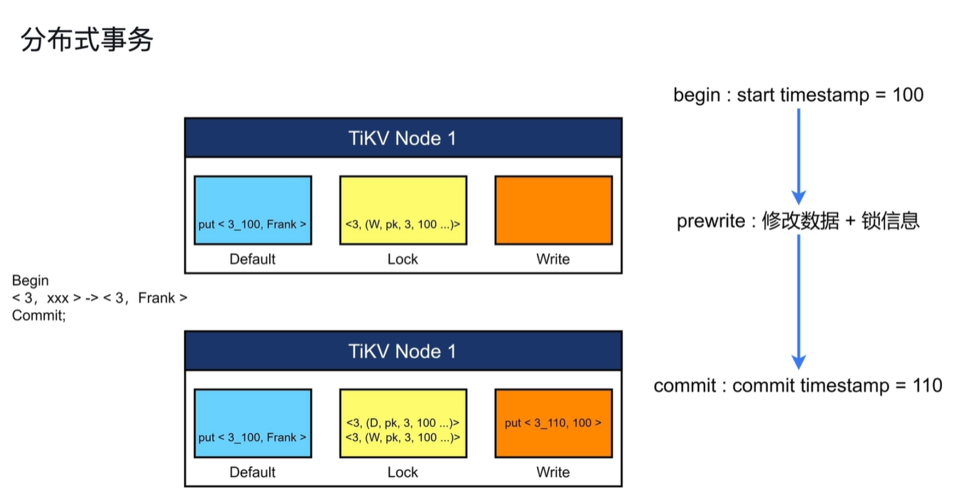 最后获得事务结束的版本号,写入write列(提交信息),删除锁