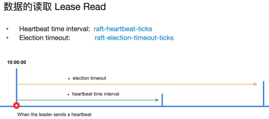 当10:00时会发出心跳数据,在下面那条线期间不会发生选举,并且在这段时间内不用发心跳。只有过了Election timeout这段时间过后才会发生leader选举。