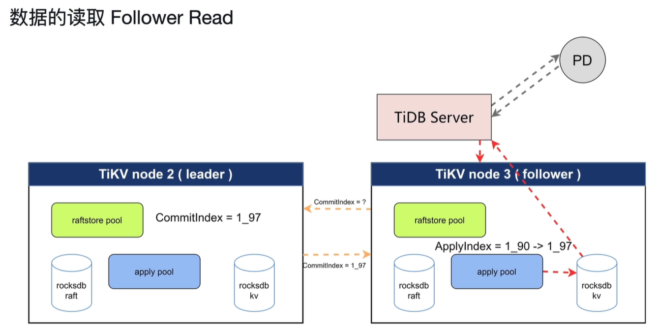 读取follower的数据,减轻leader的压力。但是会产生主从不一定同步apply这样的问题。所以会先从leader获取Commitindex的数据,直到follower的apply到Commitindex的值时开始读取。