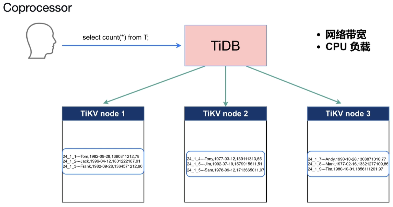 解决当如上情况出现时会有大量数据向TiDB聚合,增大开销。这时候Coprocessor(协同处理器)会在当前节点计算,将计算结果发往TiDB中。TiDB收到数据会进行简单的二次整理,大大减轻了TiDB的计算和网络开销。