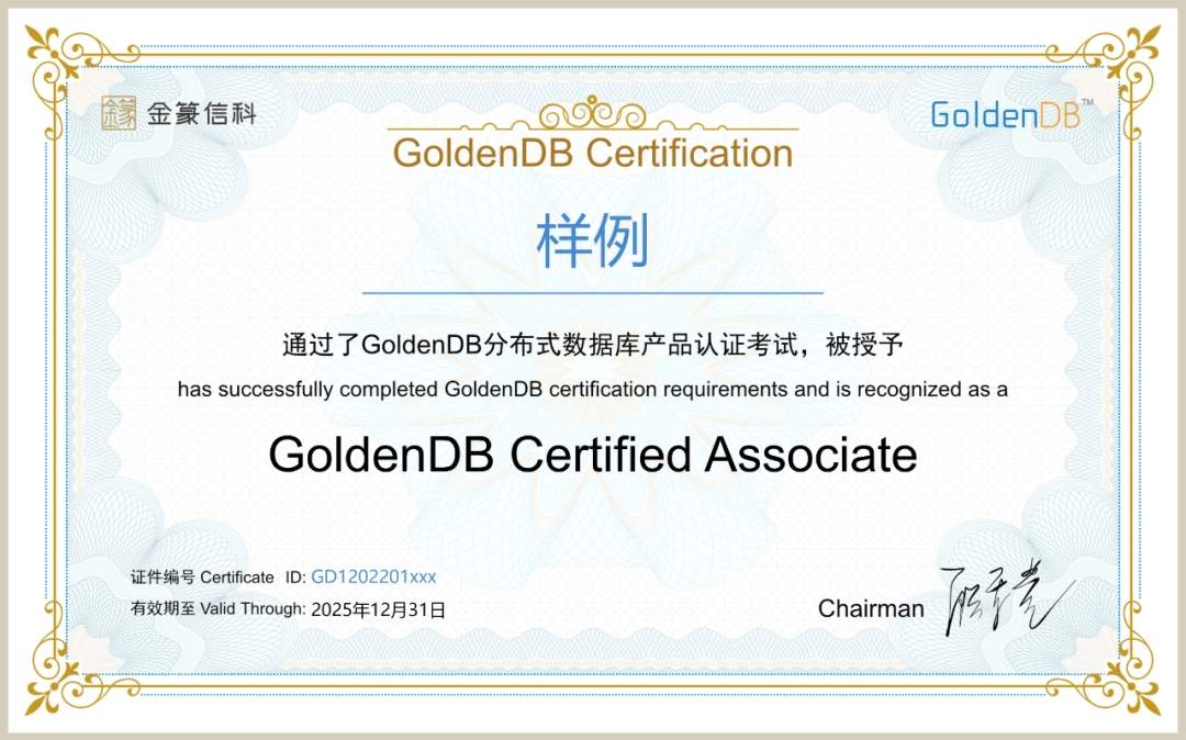 GoldenDB培训认证分为GDCA,GDCP和GDCM三级,GoldenDB 数据库认证专员,是三级认证中最基础的认证,认证通过之后可以颁发GDCA证书。